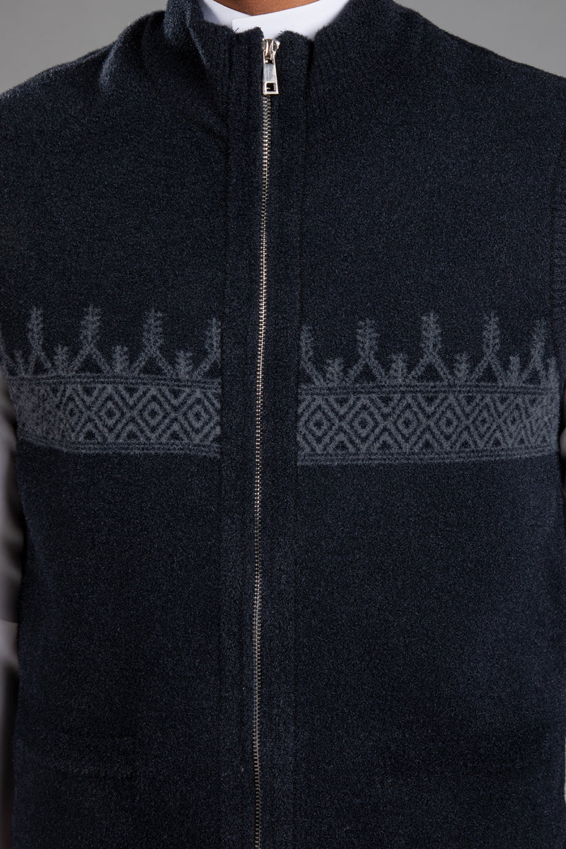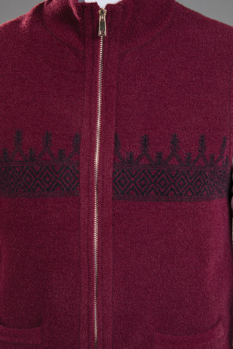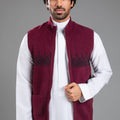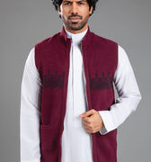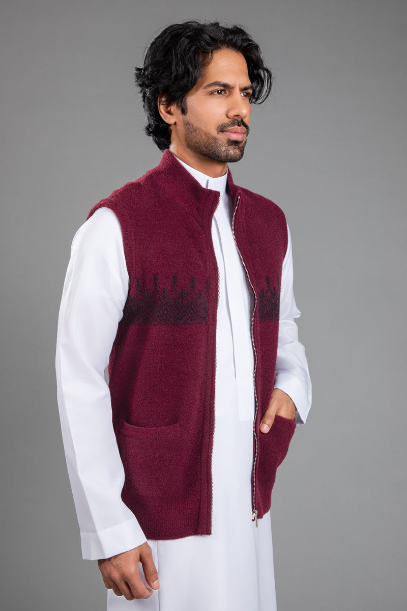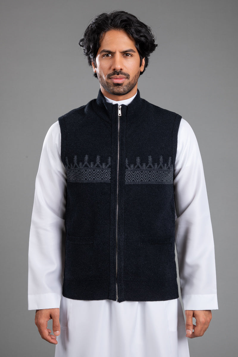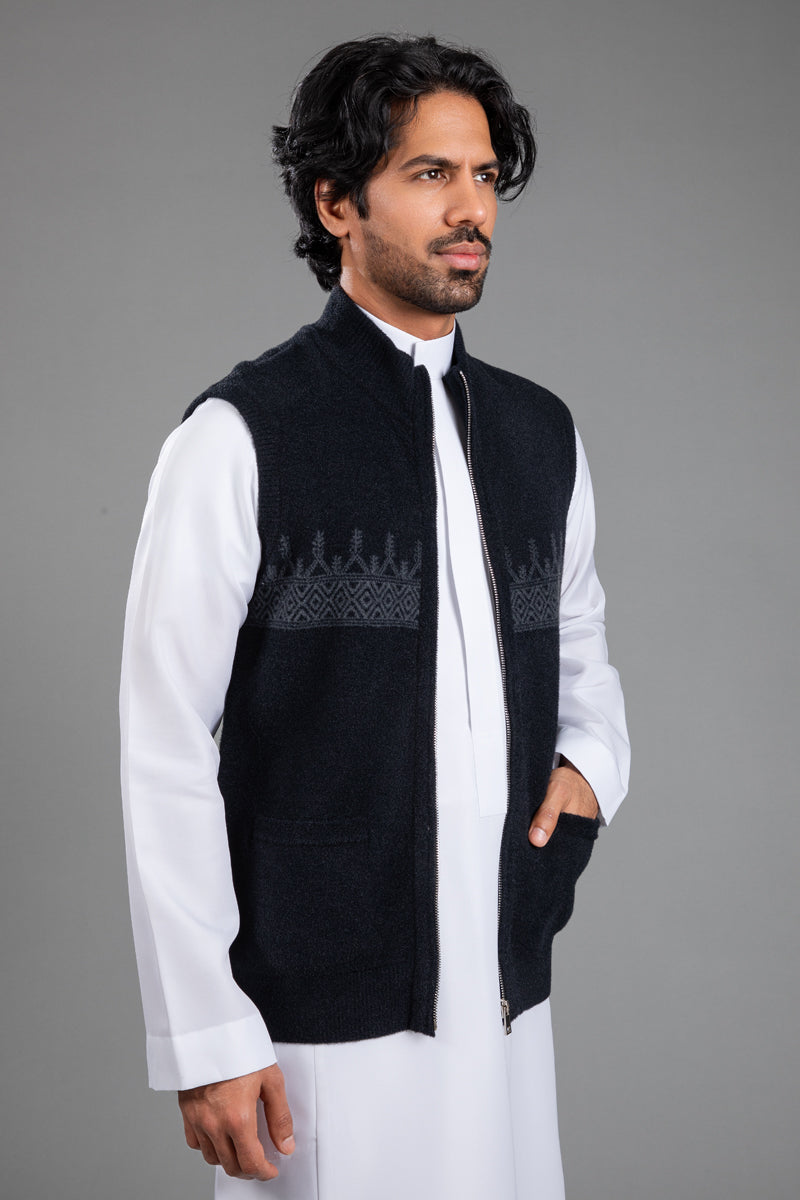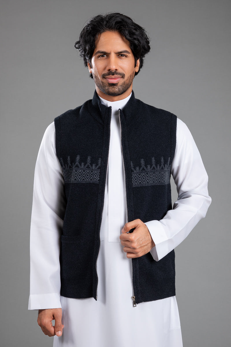 سديرية بتصميم أنيق يجمع بين البساطة والطابع التراثي، مع نقوش منسوجة تمتد بشكل أفقي على الصدر تضيف لمسة مميزة تعكس الهوية بأسلوب عصري وهادئ.