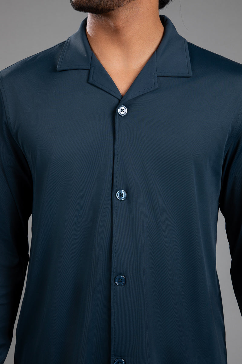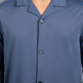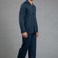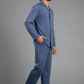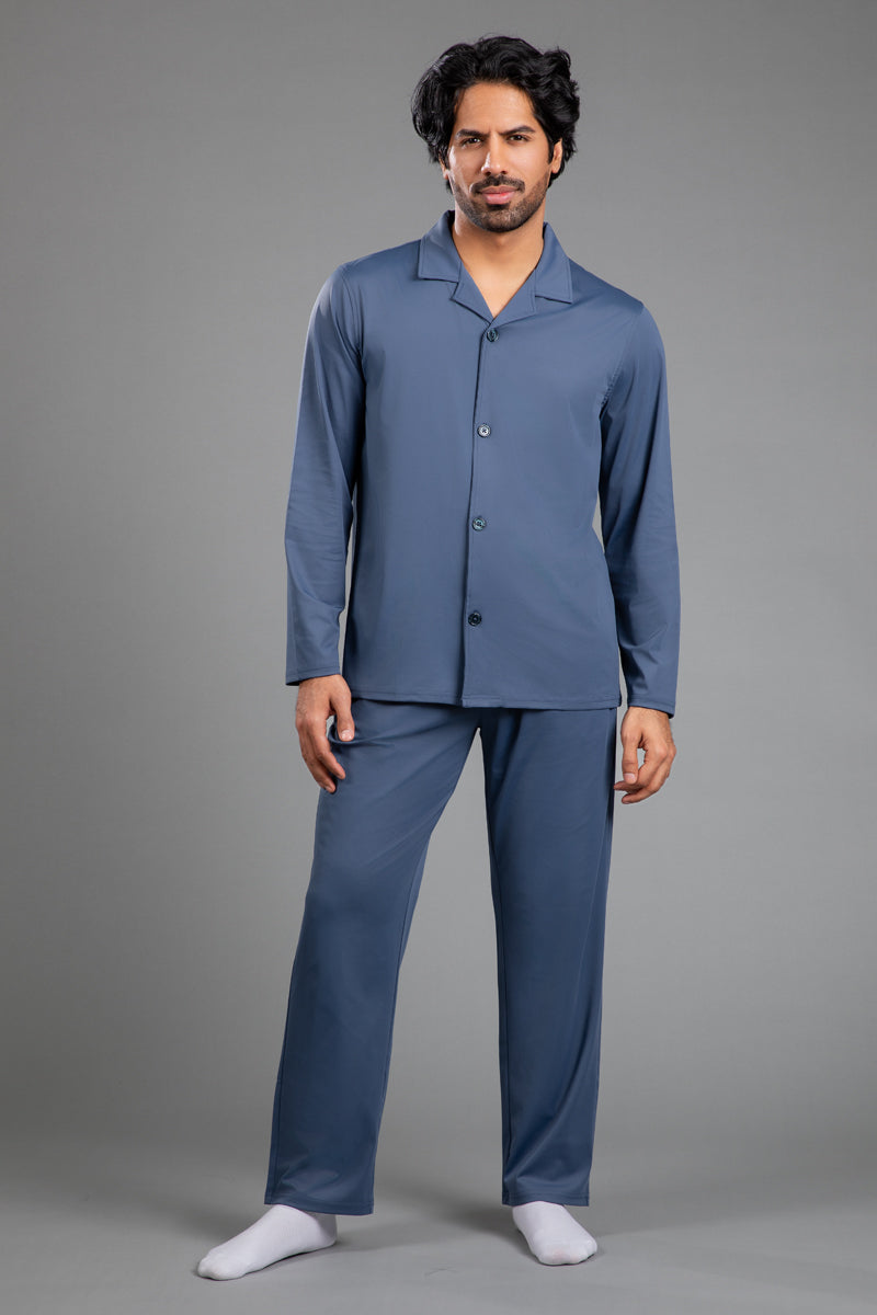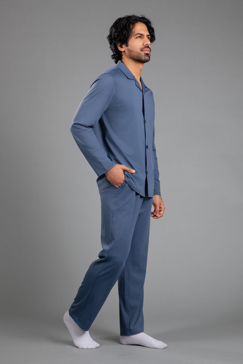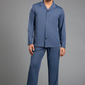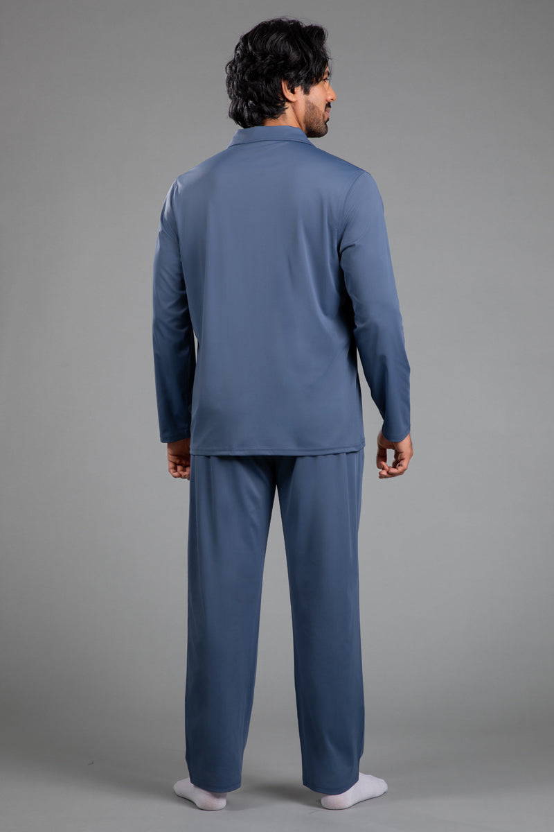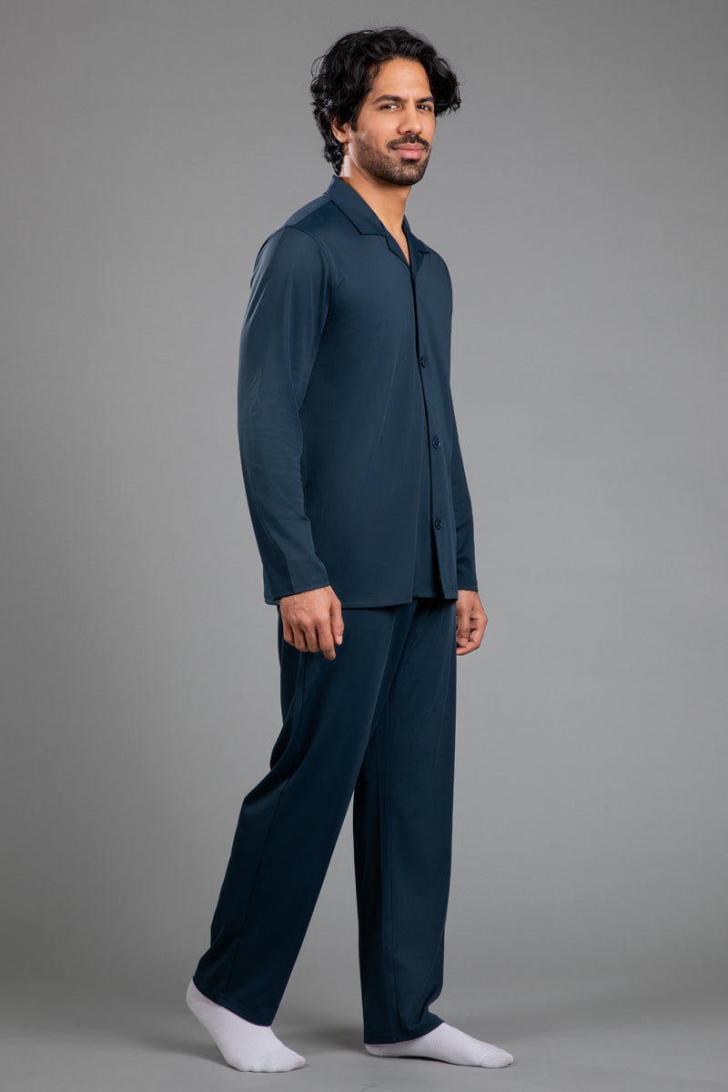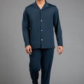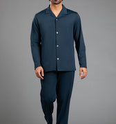 A modern and comfortable men’s pajama set featuring a long-sleeve button-down shirt with a relaxed silhouette for effortless movement.