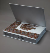 يأتي هذا الشال الرجالي مصنوعاً من صوف الباشمينا، والذي يُعدّ من أرقى وأفضل أنواع الصوف الكشميري من حيث الجودة والنعومة والخفة. يتميّز القماش بملمس فاخر وانسيابية مريحة، مع دفء متوازن يجعله مناسباً للاستخدام اليومي والمناسبات الرسمية. يحافظ الشال على قماش موحّد، بينما تختلف النقشات المطرّزة التي تضيف لكل قطعة طابعاً خاصاً مستوحى من الزخارف التراثية الكلاسيكية، منفّذة بدقة عالية تعكس حرفية راقية واهتماماً بالتفاصيل. يُقدَّم الشال داخل علبة أنيقة مخصّصة، ليكون خياراً مثالياً للإهداء أو لإكمال الإطلالات الرسمية بذوق متزن وفخامة هادئة، بما يعبّر عن هوية فالي التي توازن بين الأصالة والجودة العالية.